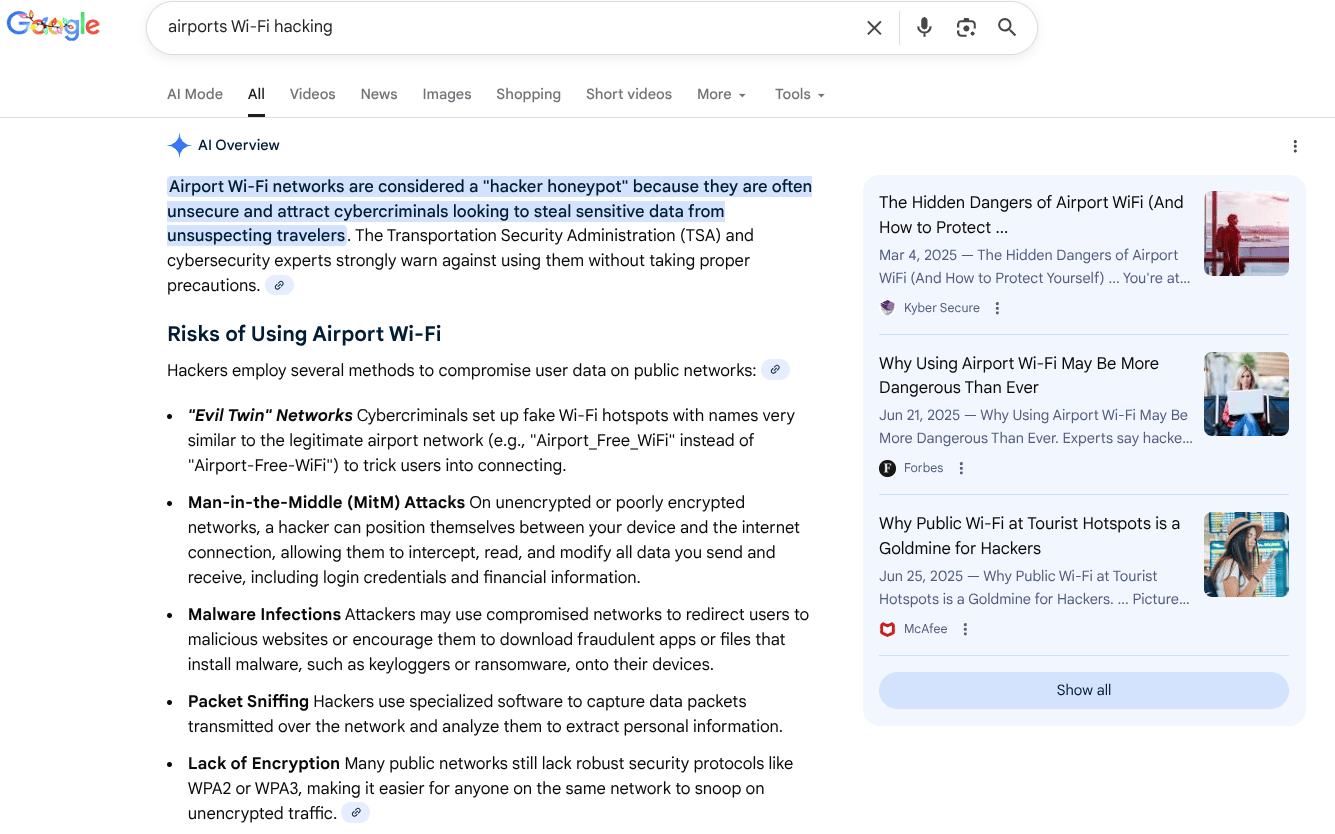 The AI Overview begins: “Airport Wi-Fi networks are considered a "hacker honeypot" because they are often unsecure and attract cybercriminals looking to steal sensitive data from unsuspecting travelers. The Transportation Security Administration (TSA) and cybersecurity experts strongly warn against using them without taking proper precautions.”
